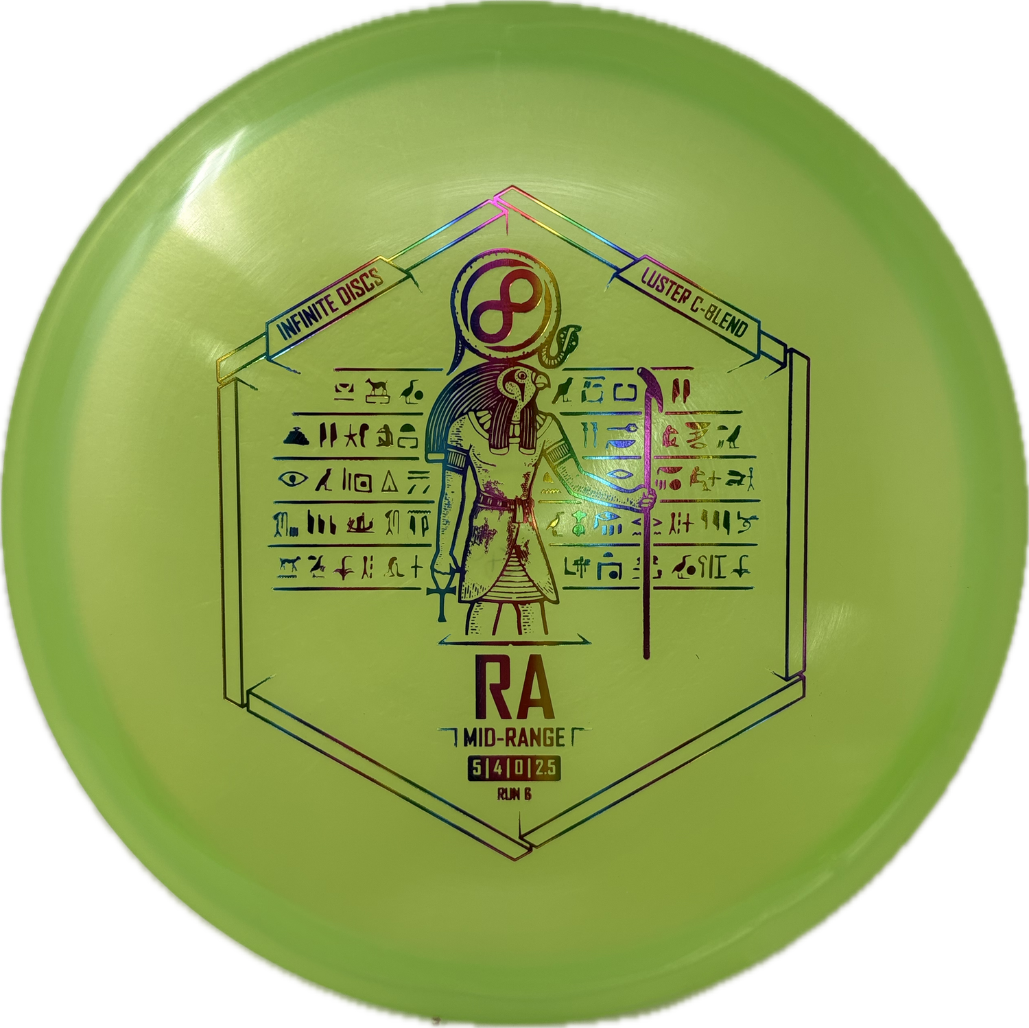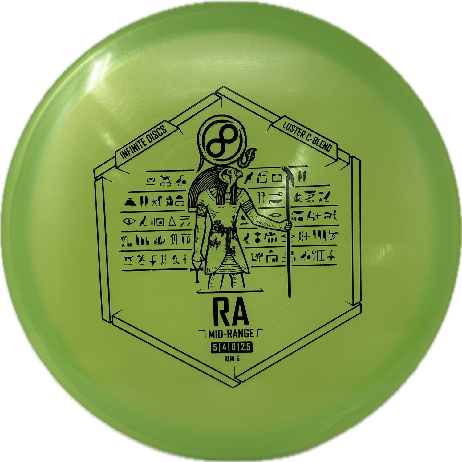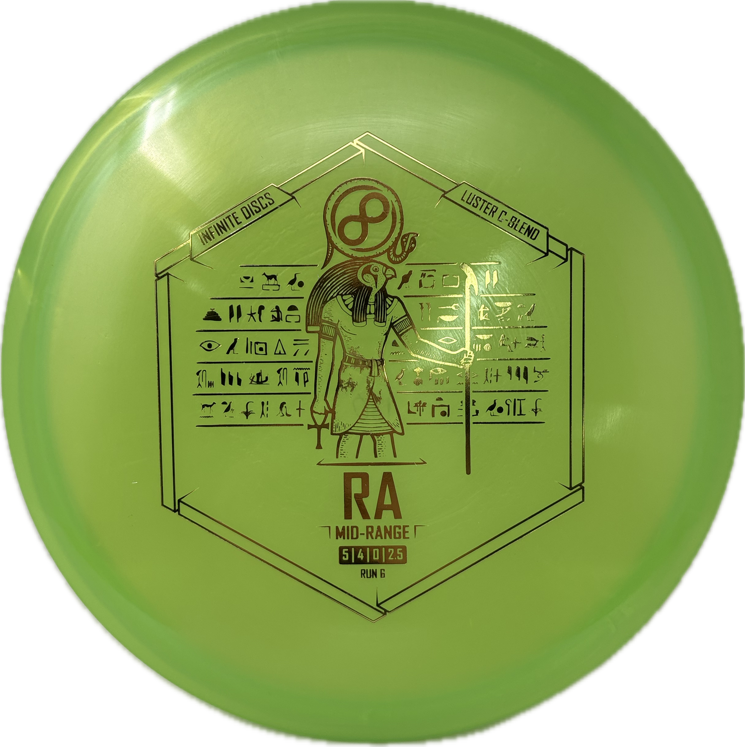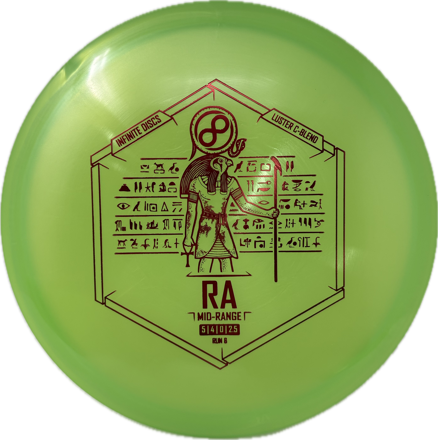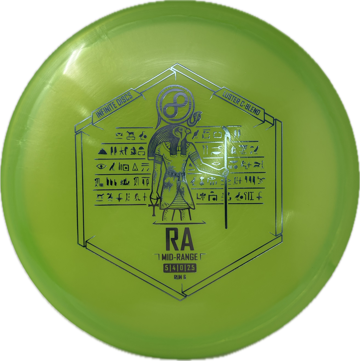 The Infinite Discs Ra is a moderately overstable midrange with a very flat top and comfortable, beaded rim. It utilizes Innova's V-technology to provide incredible torque resistance. It feels and flies perfectly for both backhand and forehand players. It is difficult to find a midrange that is so easy to control and so precise under multiple course conditions.