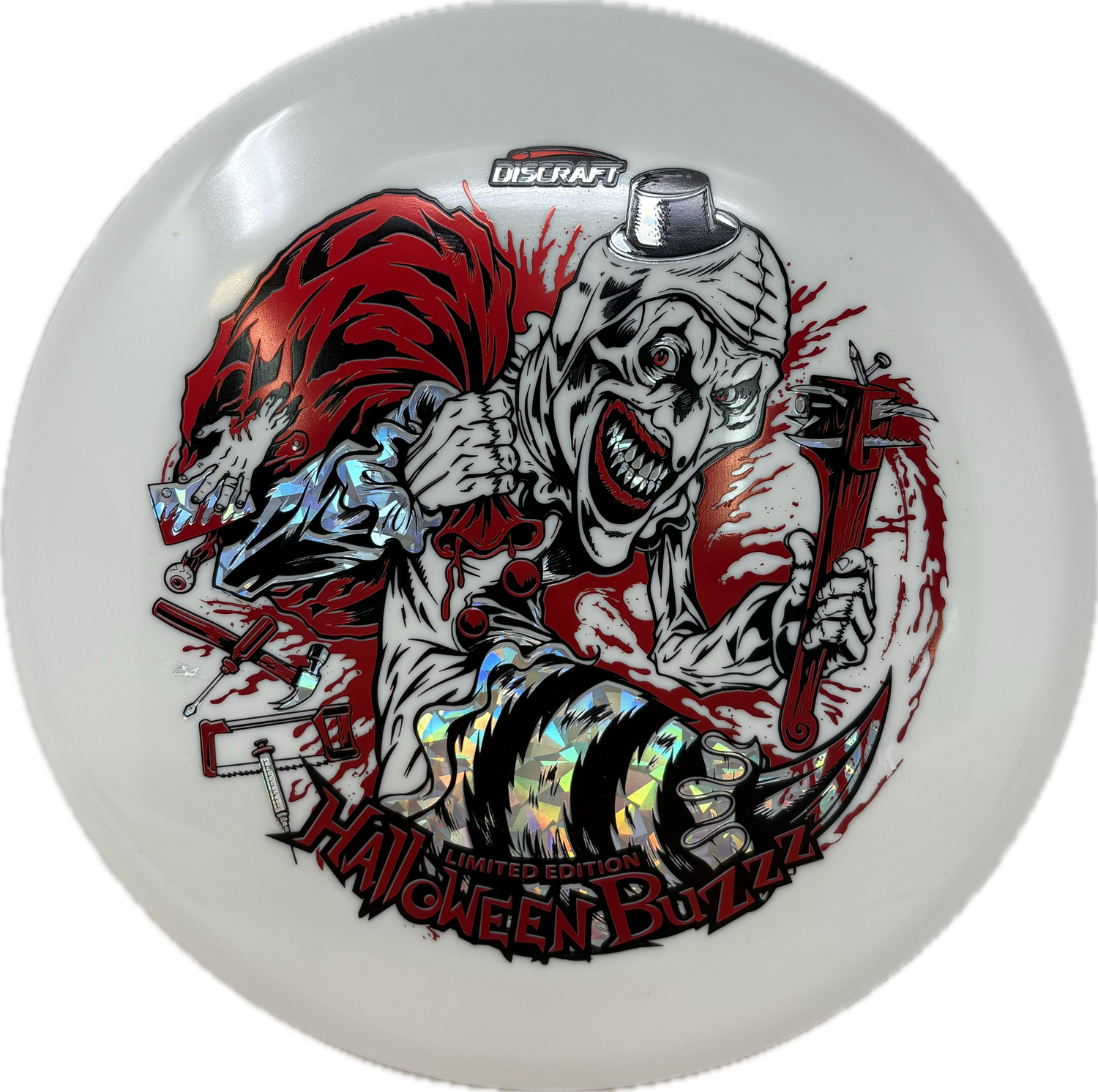 The Single-Foil Mega-Glo Halloween Buzzz turns darkness into its stage. Made from our popular Mega-Glo blend, this disc shines brighter and longer than any glow disc we’ve ever made. A minimalist single-foil stamp lets the unsettling clown artwork glow through the night—perfect for glow leagues or collectors seeking the most luminous Halloween Buzzz to date!